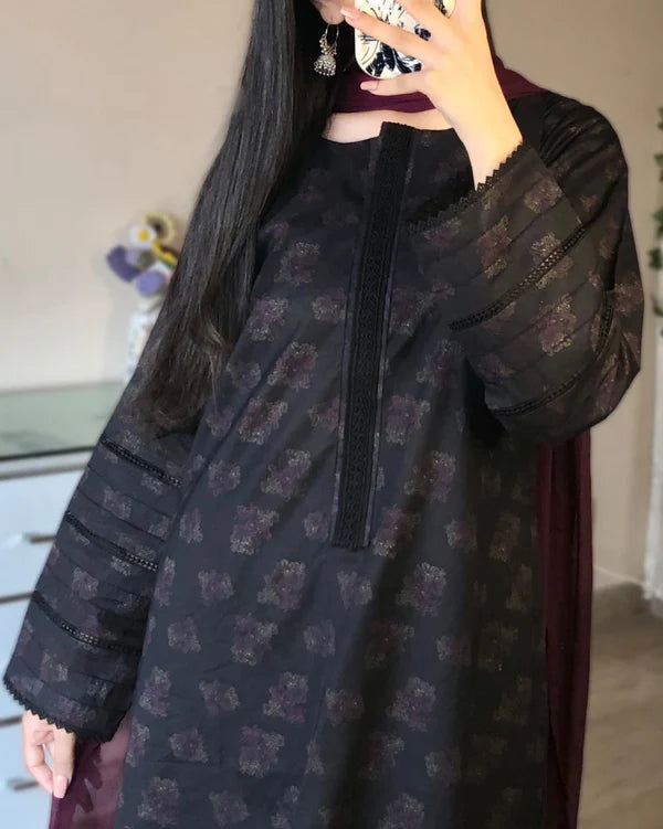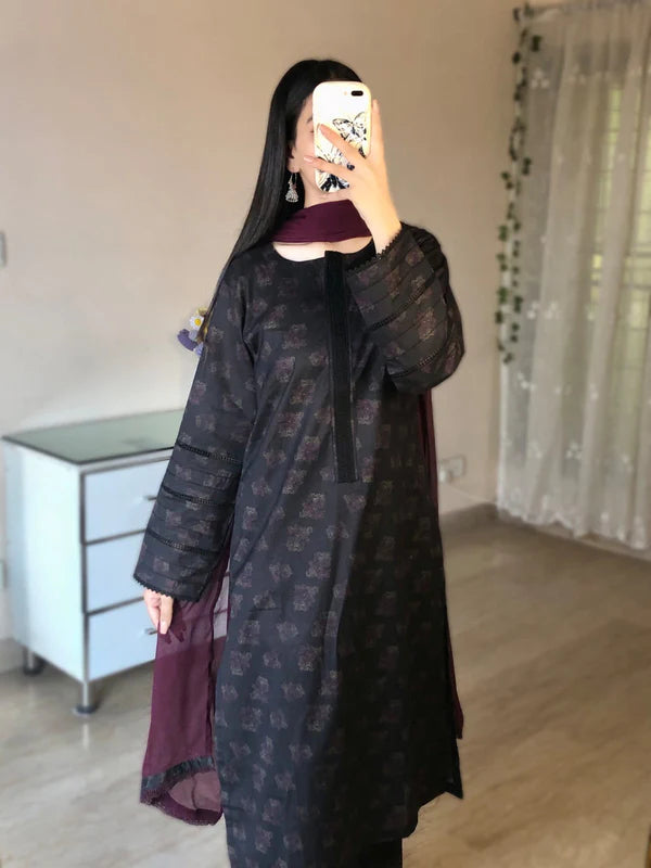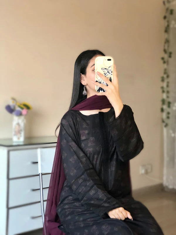 Crafted from luxurious premium lawn, this 3-piece outfit is a celebration of timeless fashion. The shirt showcases intricate prints with tasteful neck and sleeves lacework detailing, while the straight-fit trousers add structure and poise. A chiffon dupatta trimmed with fine lace completes the ensemble, making it ideal for festive occasions or elegant daywear.