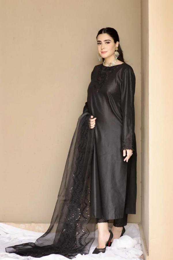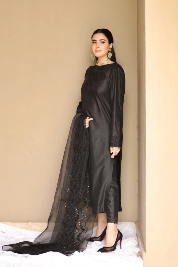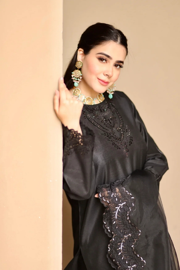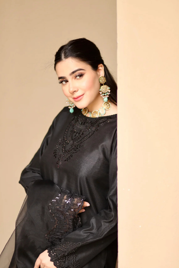 A long shirt paired with fitted trousers, featuring intricate cutwork embroidery that adds an element of sophistication and craftsmanship. The ensemble is completed with a black sequined embroidered dupatta, bringing a touch of glamour and sparkle to the elegant design. The detailed embroidery on both the shirt and dupatta creates a striking contrast, making this outfit a perfect blend of traditional artistry and modern elegance.